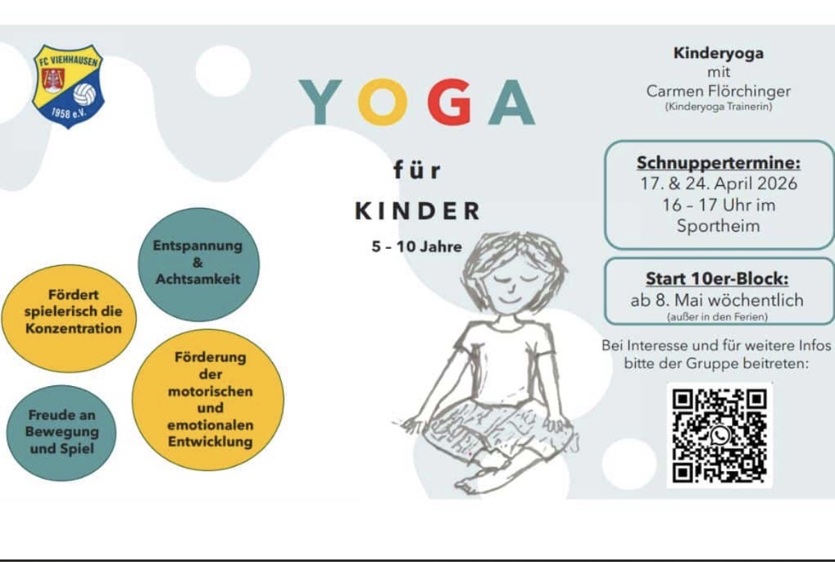 Unser neues Angebot für Kinder von 5 bis 10 Jahren verbindet Achtsamkeit, Freude an Bewegung und eine liebevolle Förderung der motorischen wie emotionalen Entwicklung. Mit Kinderyoga‑Trainerin Carmen Flörchinger können die Kinder in einer entspannten Atmosphäre ausprobieren, zur Ruhe kommen und gleichzeitig Spaß haben. Schnuppertermine finden am 17. und 24. April von 16 bis 17 Uhr im Sportheim statt – wir freuen uns auf viele kleine Yogis. Nähere Infos auch in der WhatsApp-Gruppe - siehe QR-Code